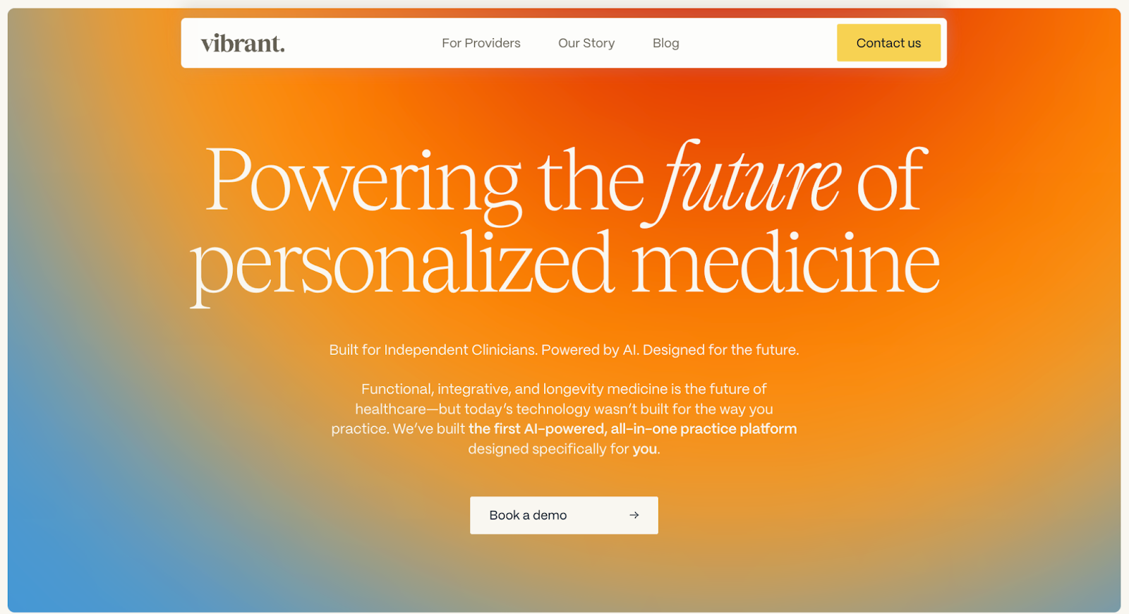 Vibrant’s homepage, designed by Paper Tiger, grabs attention with an orange-and-blue color palette and elegant fonts that reinforce the brand’s creative identity. This page uses whitespace to prevent the bold colors and large images from overwhelming readers, while clear navigation and headlines (i.e., “For Providers” and “Our Story”) make it effortless to learn about the company and explore the product’s features.