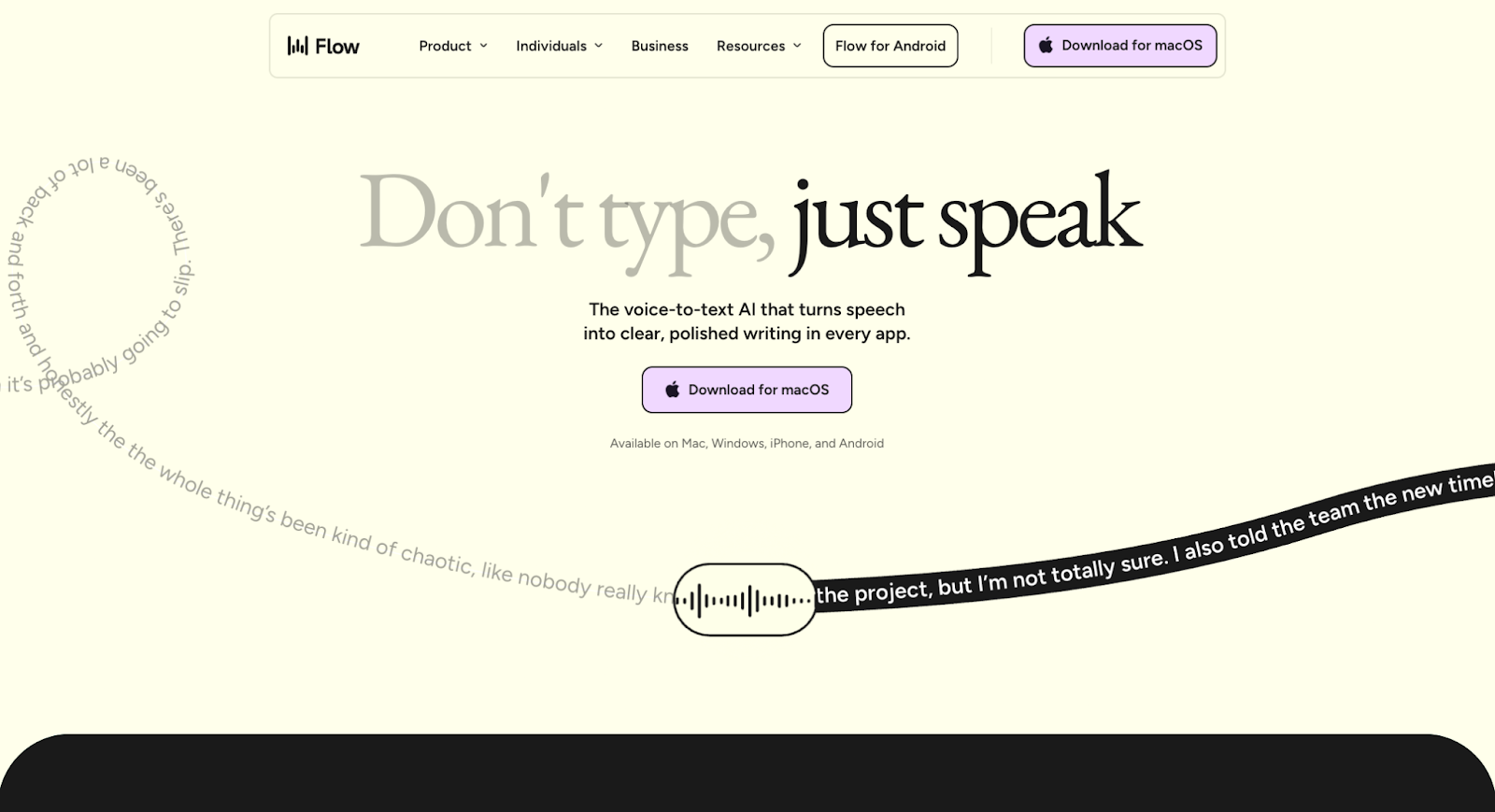 Wispr Flow’s homepage builds a compelling narrative by showing visitors how the product works, instead of just telling them. The scrolling banner above the fold visualizes the product’s voice-to-text function, and right below is a high-definition video that demonstrates the tool in action. Plenty of CTA buttons throughout the page encourage visitors to give the product a try.