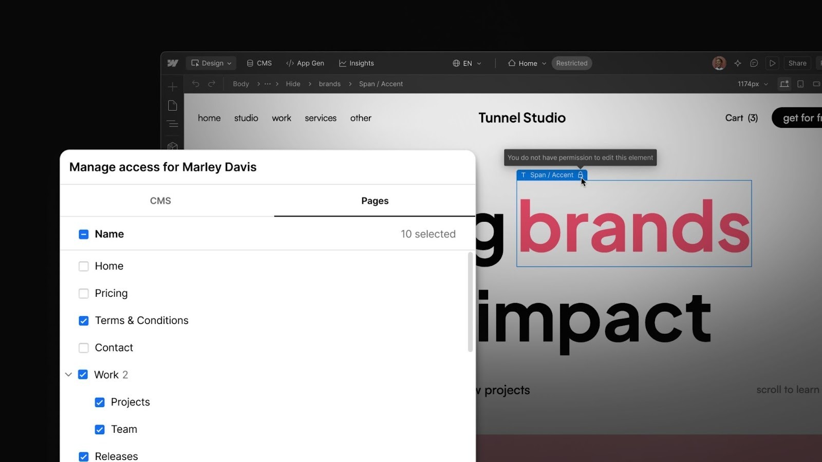Until now, access control in Webflow worked at the site level. Roles defined what someone could do, but not where they could make changes. That works for small teams. It breaks down when 20 contributors need access to the same site and the only way to prevent mistakes is a Slack message that says "please don't touch the pricing page."